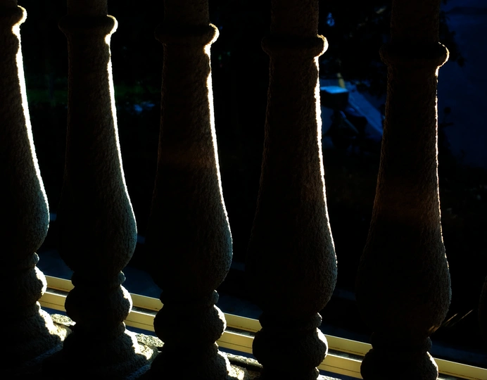 摄于上海静安区少儿图书馆。斜阳照在围栏上,勾勒出美妙的线条。栏外一抹幽蓝融入了画面,与暖阳金色形成色调对比。选了这个视角,高光比视效记录此刻此景。
