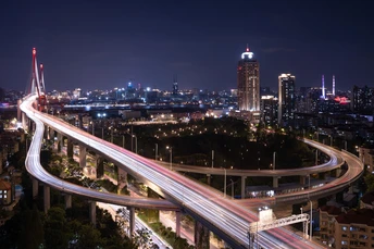 桥上的车流光轨纵横交错,似流动的音符,与城市交通的繁忙与活力一起,交织出一场华丽的乐章。