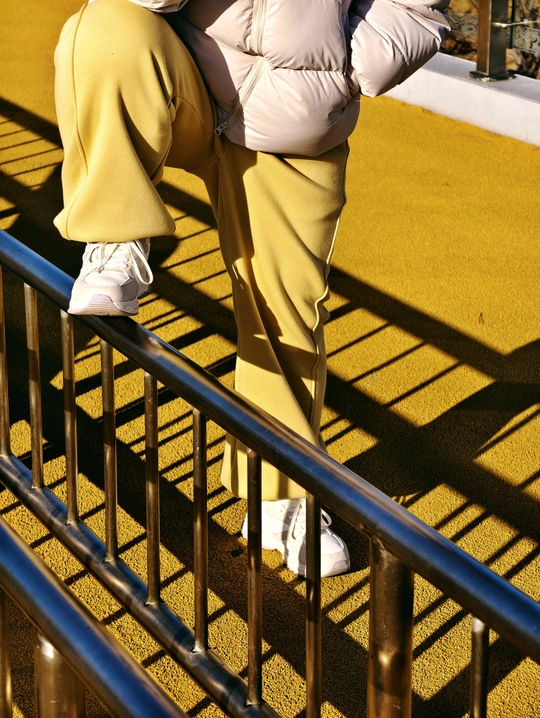 一名站在街头栏杆旁的女子,黄色的裤子和地面的颜色,巧妙的融合在一起。