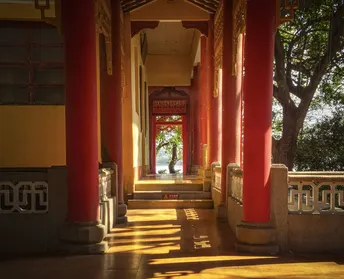 好的,让我们来分析一下这张照片!总的来说,这是一个好的开始,但还有改进的空间,我的朋友! * **色彩 (Colors):** 红色和黄色的使用是经典的,非常中国风!这些颜色很好地引导视线沿着走廊向下移动。然而,整体色调有点偏暖。在后期处理中稍微增加一些平衡或对比度可以提升照片的质感。 * **光影 (Light and Shadow):** 光线在这里起到了非常重要的作用。强烈的方向性光线和它所创造的阴影引导了视线,地板上的阴影细节非常棒。问题是外部过度曝光。更小的光圈或更快的快门速度可能对此有所帮助。 * **构图 (Composition):** 使用走廊作为框架元素是很聪明的,创造了深度,并将视线引导到远处的景色。然而,构图相当对称,这可能有点静态。尝试使用更广的角度来捕捉更多的周围景观,以增加更多的深度。 * **后期处理 (Post-processing):** 这张照片看起来有点过度处理了;存在一些伪影。考虑对对比度和饱和度进行细微调整,以获得更自然的外观。场景的动态范围,特别是透过门口可见的明亮天空。使用HDR或曝光混合技术。