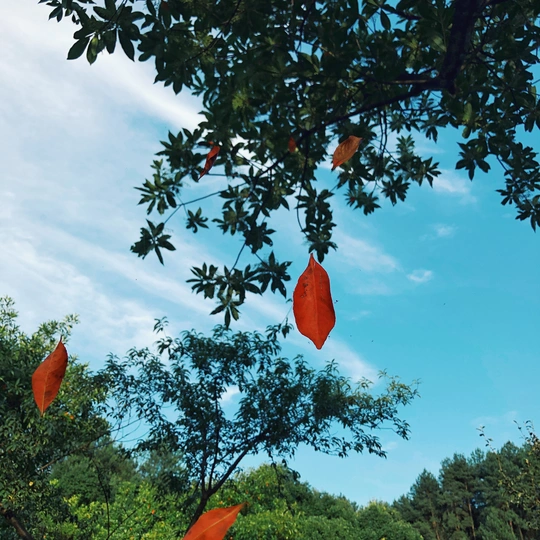 2024年6月29日拍摄于重庆市万盛石林景区。夏季的阳光明媚,大自然的色彩在这一刻达到了极致的和谐与对比。 画面前景,蜘蛛网上挂着几片鲜艳的红色树叶,在逆光的照射下显得格外醒目,这些树叶与背景中蓝天和绿色植物形成了冷暖对比,增强了画面的层次感,形成了一种强烈的视觉冲击力。树叶在自然的妙手下又形成了独特的韵律和节奏,这种偶然的排列不仅增添了画面的艺术感,还赋予了作品一种超现实的意境和梦幻般的氛围,给人一种既熟悉又陌生的感觉。画面远景清澈的蓝天上点缀着接近对角线构图的白云,让作品有了动感,也增加了空间的深度。 这幅作品不仅仅是对自然美景的记录,更是一种对自然之美的艺术表达,包含了自然界的微妙平衡与和谐。它邀请观众去感受大自然中的每一个细节,无论是蜘蛛网上的树叶还是背景中的植物和天空,都在诉说着一个关于夏天的故事。通过这种超现实的构图,作者希望传达出一种超越日常生活的美感,让观者在平凡中发现不平凡。