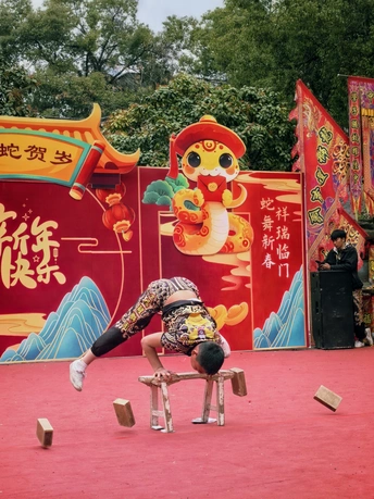 大年初五,当是拜财神之日。武汉市黄陂区大余湾的庙会,却十分火热。小小的杂技演员,将6块金色木砖头竖立在小长凳子两边,然后双手撑在上面,呈倒立状。 突然间,小演员将6块木金砖朝两边推开,整个身体刹那间垂直下落,木金砖尚未完全落地,而小演员的双手已经落在了凳子上,丝毫伤害没有,让观众惊讶不已。