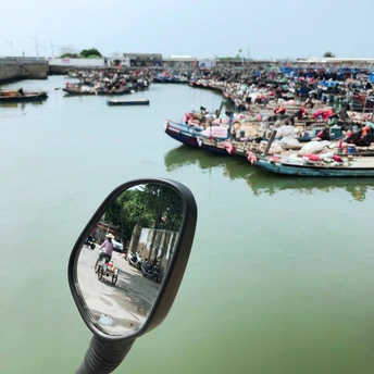 作品拍摄于2024年4月18日福建省的一处渔船码头。 前景中,车辆的后视镜清晰地反射出一辆人力三轮车驶过的场景,戴着草帽的人物姿态和动作显得自然而生动。后视镜将陆地上的交通工具与水面上的渔船巧妙结合,形成了一种独特的空间对话,增加了画面的层次感和趣味性,使得原本普通的场景变得独特而引人注目。背景是一片淡雅的绿色海面,众多渔船汇聚成一条美丽的曲线,形成了一幅独特的画面。整个画面色彩柔和,给人一种宁静而富有生活气息的感觉。
