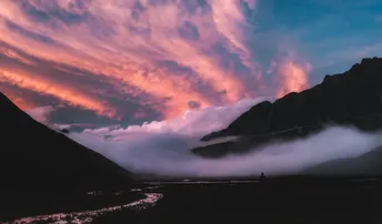 在川西徒步的其中一个晚上,我们扎营后开始准备晚餐,期间一直在餐厅帐篷中取暖聊天,晚饭即将出锅时,我准备去河边洗洗碗筷,刚一踏出帐篷,便被眼前的景观震撼住了。云海从山谷下方慢慢爬上来,在河谷中覆盖了一层,云海之上晚霞映红了大半个天空,有一人背对云海慢慢朝我们的帐篷走来,给人一种乘云驾雾的感觉,我急忙叫出帐篷中的队友一起欣赏这罕见的壮丽景观。