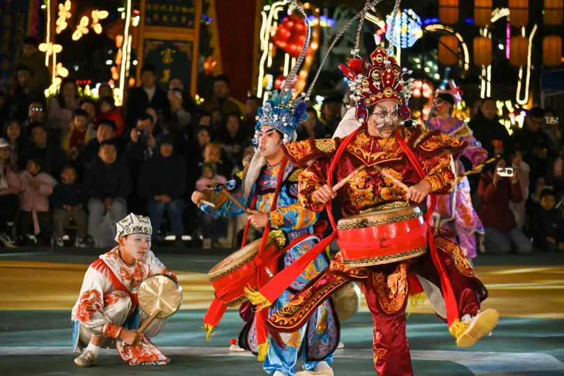此作捕捉英歌舞精彩瞬间。舞者扮相英武,身着绚丽戏服,浓墨重彩的妆容与精致头饰尽显传统韵味。他们身姿矫健,击鼓而舞,动作刚劲有力,洋溢着蓬勃生命力。背景中观众簇拥,灯火璀璨,烘托出热闹非凡的节日氛围,生动展现了英歌舞这一传统民俗艺术的独特魅力与深厚底蕴。 构图上,画面聚焦于舞者,人物动态鲜明,形成视觉中心,前景舞者与背景观众层次分明,展现出表演的现场氛围。 光影方面,现场灯光照亮舞者,突出其鲜艳服饰与面部妆容,明暗对比增强了画面立体感与视觉冲击力。 色彩上,舞者服饰色彩浓烈,红、蓝、金等色彩交织,极具张力,与背景灯光色彩相互映衬,彰显英歌舞的热烈与活力。