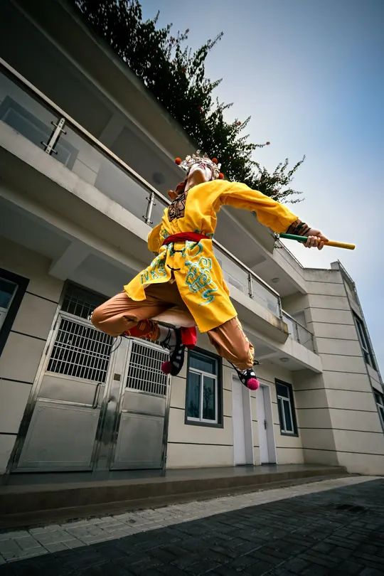 这张照片定格英歌舞演员极具张力的瞬间。他身着明艳戏服,服饰上的精美纹饰与华丽头饰,尽显传统风采。演员高高跃起,手中道具挥舞,身姿矫健,每一处肢体语言都散发着英歌舞刚劲奔放的神韵。背景的现代建筑与演员的传统扮相形成鲜明对比,不仅突出了英歌舞独特的艺术魅力,更展现出这一古老民俗艺术在当下依旧蓬勃的生命力与感染力。 构图上,中心构图将跃起的英歌舞演员置于画面中心,与简洁现代建筑背景形成繁简对比,超广角带来了动作的张力与美感,突出主体,增强视觉冲击力。 光影方面,巧妙运用自然光,从侧面或斜上方照射,清晰勾勒演员身形,明暗过渡自然,强化立体感和动作力量感。 色彩上,演员艳丽戏服与背景的灰白色调强烈对比,凸显英歌舞热烈奔放的艺术特色,极具视觉张力。