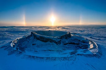 内蒙古高原上的火山口白雪皑皑,恰逢日晕现象。