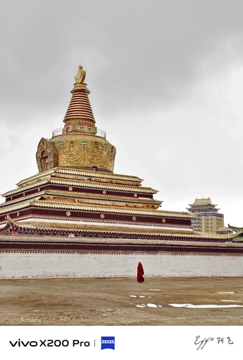 阴郁的天空下,一位僧人在佛塔边前行,庄严而肃穆