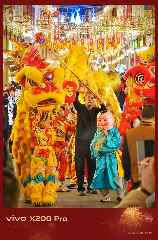 在璀璨的灯笼下,有小孩子组成的舞龙队伍穿梭于热闹的街道,传递着新年的祝福与希望。