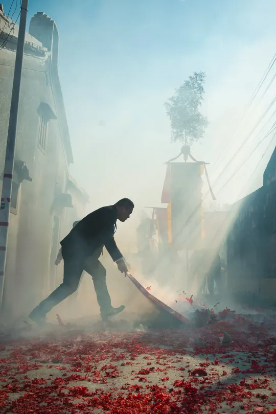 潮汕地区年俗英歌舞、在表演前家家户户会点燃爆竹来迎接。歌舞队等待爆竹清扫、烟雾消散,好戏登场。