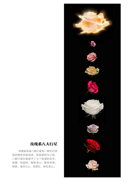 玫瑰系 以“玫瑰”作为载体的宇宙研究 从哥伦布到康德和拉普拉斯,到牛顿,对宇宙的研究代表了一种秩序、一种信仰,它激发自由的探索,并让我们相信,在所能触摸的洞穴生活之外,有神秘而迷人的星空。 天象学教会我们的祖先以看得见的天文观测理解自我与天地的存在,在“看得见”之外,复杂的天文问题如今被带入了以观测为基础、理论物理学为模型的探索和预测中。对“看不见”宇宙的好奇催生天体物理学家们对宇宙模型建构的热情,150亿年间散落的时间和空间被天文学家拾起,这些记录被简化为公式,引向人类尺度之外自我意识所铸的旅程。 《玫瑰系:以玫瑰作为载体的宇宙研究》用两种不同的天文视角重塑出一片始于坍缩的玫瑰气体云,对天文历史上节点性的“虚构”事件和对星球推测的图像表达成为“玫瑰系”构建的基础,九颗来自云南晋宁的玫瑰星球成为重新构建玫瑰星系结构的媒介,它们在相机前被镜头重新凝视,并得以在一层层堆叠出的具象里被数据解剖的方式陈列。 对一个虚构星系的操作,营造了一个小而独立的世界,它们的存在暗示着我们周围强大而神秘的宇宙,也得以成为让我们对生息宇宙理解的致敬和反思。