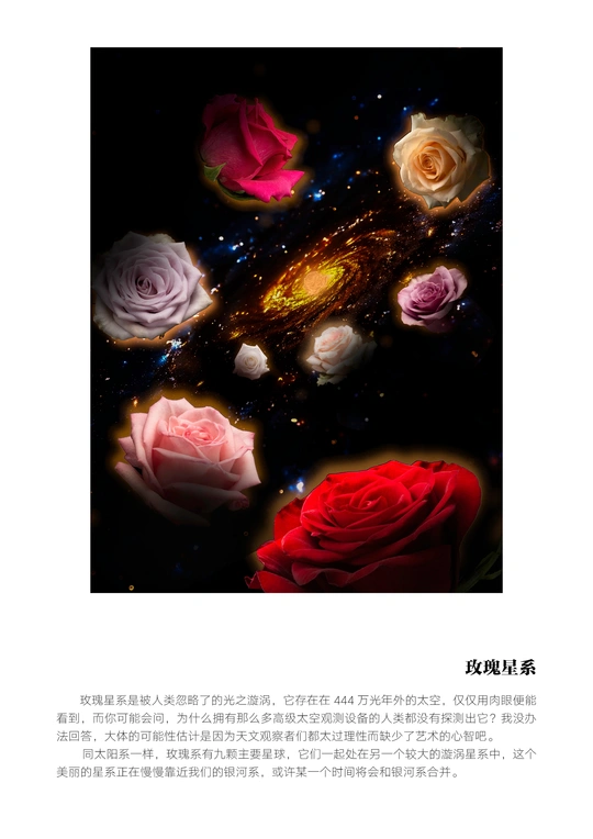 玫瑰系 以“玫瑰”作为载体的宇宙研究 从哥伦布到康德和拉普拉斯,到牛顿,对宇宙的研究代表了一种秩序、一种信仰,它激发自由的探索,并让我们相信,在所能触摸的洞穴生活之外,有神秘而迷人的星空。 天象学教会我们的祖先以看得见的天文观测理解自我与天地的存在,在“看得见”之外,复杂的天文问题如今被带入了以观测为基础、理论物理学为模型的探索和预测中。对“看不见”宇宙的好奇催生天体物理学家们对宇宙模型建构的热情,150亿年间散落的时间和空间被天文学家拾起,这些记录被简化为公式,引向人类尺度之外自我意识所铸的旅程。 《玫瑰系:以玫瑰作为载体的宇宙研究》用两种不同的天文视角重塑出一片始于坍缩的玫瑰气体云,对天文历史上节点性的“虚构”事件和对星球推测的图像表达成为“玫瑰系”构建的基础,九颗来自云南晋宁的玫瑰星球成为重新构建玫瑰星系结构的媒介,它们在相机前被镜头重新凝视,并得以在一层层堆叠出的具象里被数据解剖的方式陈列。 对一个虚构星系的操作,营造了一个小而独立的世界,它们的存在暗示着我们周围强大而神秘的宇宙,也得以成为让我们对生息宇宙理解的致敬和反思。