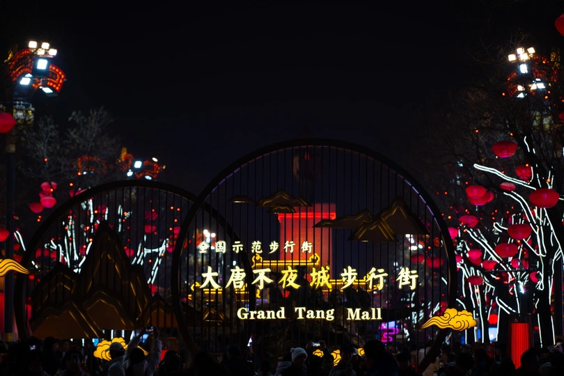 西安大唐不夜城是中国陕西省西安市的一个著名文化旅游景区,位于大雁塔南广场以南,是一个以盛唐文化为背景,集购物、餐饮、娱乐、休闲、旅游、商务为一体的综合性文化商业区。大唐不夜城的建筑风格模仿了唐代的建筑特色,夜晚灯光璀璨,再现了唐代长安城的繁华景象,因此得名“不夜城”。 大唐不夜城的主要景点包括: 1. 大雁塔:作为西安的标志性建筑之一,大雁塔是唐代著名的佛教圣地,也是玄奘法师取经归来后翻译佛经的地方。 2. 大唐芙蓉园:这是一个大型的皇家园林式文化主题公园,以唐代芙蓉园为蓝本,重现了唐代皇家园林的风貌。 3. 大唐西市:模拟唐代的市场,这里有许多商铺和餐馆,提供各种唐代风格的食品和商品。 4. 大唐不夜城步行街:这里是游客体验唐代文化的好去处,街道两旁有许多仿古建筑,夜晚时分灯光辉煌,非常热闹。 5. 音乐喷泉:在大雁塔北广场,有一个大型的音乐喷泉,晚上会有灯光音乐喷泉表演,吸引众多游客驻足观看。 大唐不夜城不仅是西安市民休闲娱乐的好去处,也是国内外游客了解唐代文化、体验古都风情的重要窗口。在这里,游客可以感受到浓厚的历史文化氛围,同时享受现代化的服务和设施。
