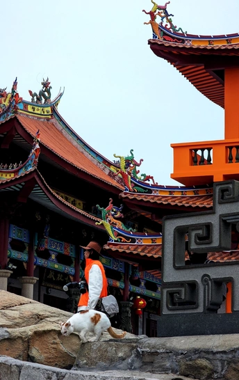 古韵建筑绘龙凤,橙瓦石阶猫步轻。东方风情宁静美,尽显祥和与雅致。