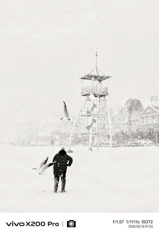 冬日的海滩,大雪纷飞、银装素裹。雪花轻舞着覆盖沙滩,如洁白地毯。游人少,更宁静。海鸥耐寒,与雪共舞、成独特海滨冬日画卷。
