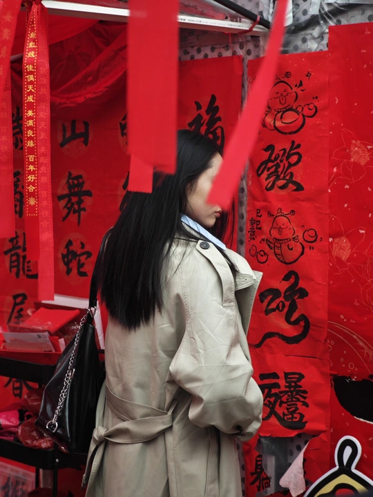 本作品摄于佛山快子路,采用侧面视角拍摄,展现人物侧身轮廓,自然且真实,能让观者感受到人物的姿态与周围环境的融合。人物位于画面中心偏左,背后是红色春联等春节元素,形成框景效果,突出主体的同时强化了节日氛围。以红色为主色调,春联的红与人物卡其色风衣形成对比,既凸显了春节的喜庆,又突出了人物,画面具有视觉冲击力。