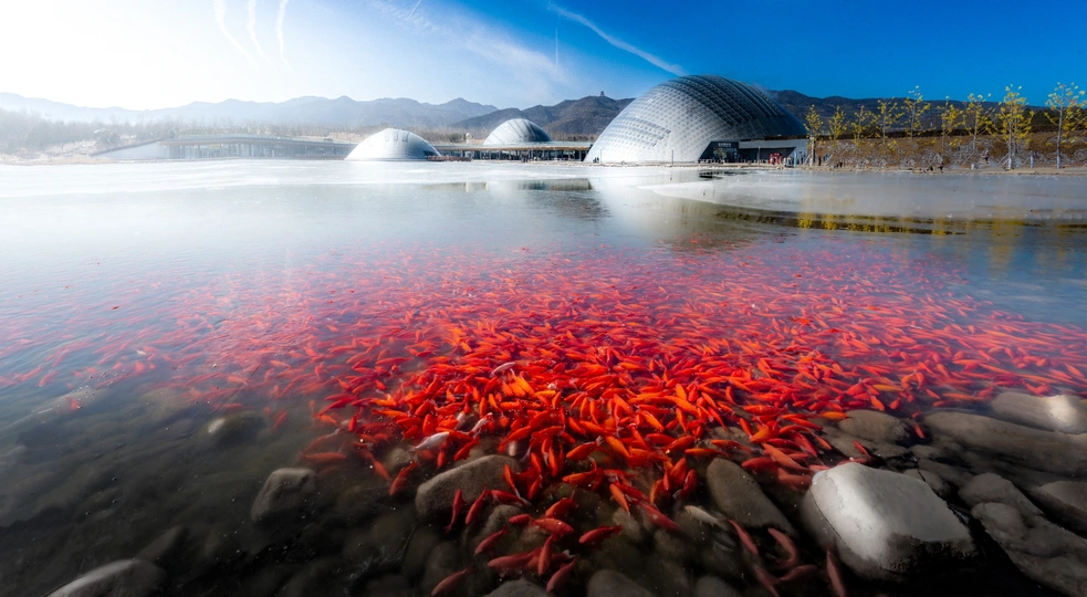 寒潮来袭,太原植物园湖面上已经凝结了一层浮冰,薄冰下,锦鲤缓缓游动,半球展馆在远处静静伫立,现代与自然交织。阳光洒下,轻柔地拂过水面,冰层微微裂开,像是时光轻语,带来一份宁静的温度。
