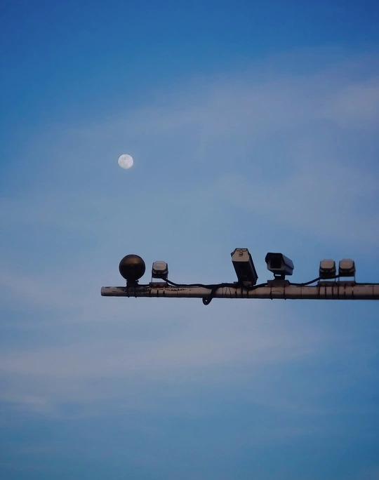 在这片宁静的蓝天下,月亮静静地悬挂着,仿佛在守护着这座城市。交通信号灯默默地矗立,见证着每一天的繁忙与宁静。生活就是这样,有时忙碌,有时平静,但无论如何,美好总是在不经意间出现。🌙✨