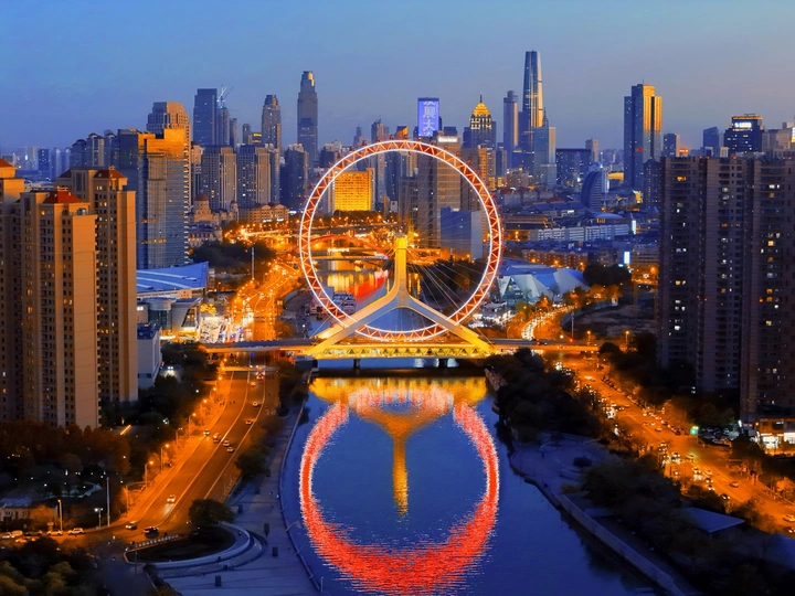 蓝调时刻的静谧光线下,天津之眼及她的倒影如同聚光灯下的主角一般矗立在海河正中央,周边高楼林立,车水马龙,组成了一副和谐美妙的天津城市景观。
