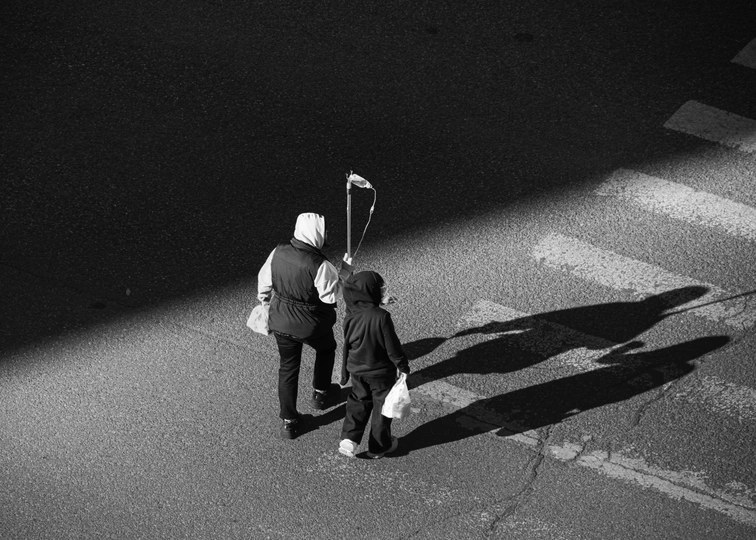街头,黑白色调下,一人手持输液杆,另一人相伴而行。那输液杆如生活的插曲,打破了街道的平静。他们步伐或许沉重,却有着彼此依靠的坚定。阳光拉长影子,似在诉说着这一程相伴的温暖与坚韧,平凡瞬间里,藏着生活的重量与相互扶持的力量。