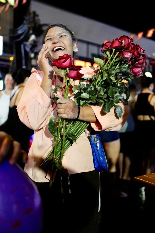 泰国新年泼水节(宋干节)曼谷街头快乐的卖花人。