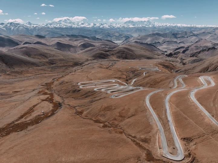 这幅航拍自西藏的绝美画面,名为《天路险境・珠峰华章》。镜头聚焦之处,珠峰之巅高耸入云,那覆盖着的千年积雪在日光的轻抚下,散发出梦幻般的银色光辉,宛如苍穹之上的神圣皇冠,尽显大自然的鬼斧神工,其威严冷峻让天地都为之失色。将目光下移,山脚下那险峻曲折的路段如巨龙蜿蜒盘旋,紧紧缠绕着珠峰的身躯。路段一侧是陡峭的悬崖,怪石嶙峋,仿佛在诉说着岁月的沧桑与地质变迁的奥秘;另一侧则是高耸入云的山壁,随时可能滚落的碎石更添几分惊险。这条通往珠峰的必经之路,承载着无数挑战的足迹,每一道弯道都暗藏着艰难险阻,却也吸引着无数勇敢者前来征服。湛蓝天空作为背景,映衬着珠峰的壮美与道路的险峻,整幅画面交织成一曲动人心魄的英雄赞歌,既展现了自然的雄浑之力,又彰显了人类探索未知的无畏勇气。