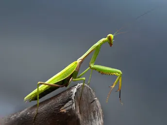 绿螳螂姿势优雅,前肢肆意地伸展着,像是在展示它那精巧而有力地肢体。它的头微微俯视,目光专注深邃,仿佛在审视脚下的世界。它就像一位绿色的精灵,展现出一种独特的自然之美和生命的灵动。