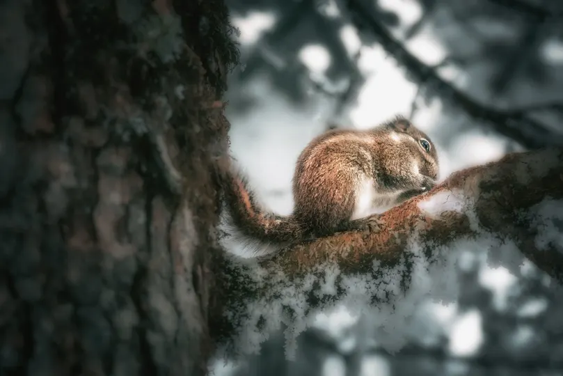 下雪天,森林里,出门活动的小松鼠,拿了东西就跑掉躲起来吭哧吭哧的吃。