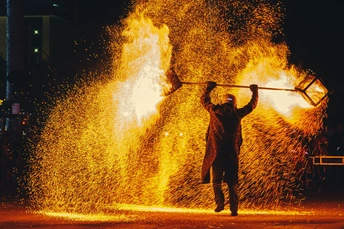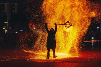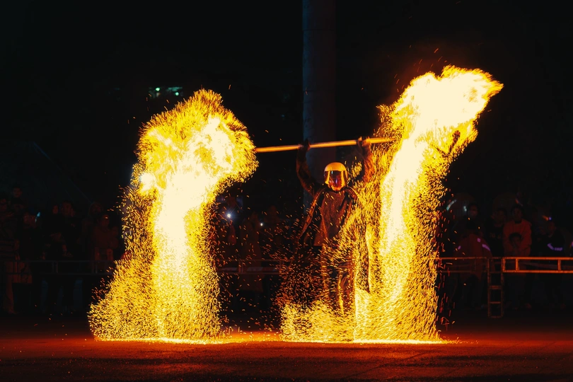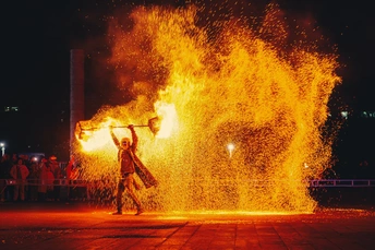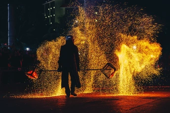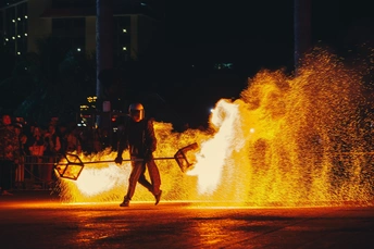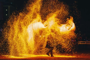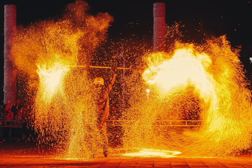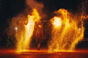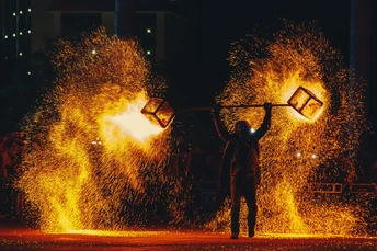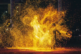 火壶表演是一种独特的中国传统艺术形式,融合了武术、杂技、舞台灯光、舞蹈和音乐等多种艺术元素。表演者将烧好的木炭放入特制的铁网中,通过抖动铁网使木炭产生火花,形成类似“火树银花”的美丽景象。这一过程不仅展现了表演者的技巧和勇气,也寄托了人们对美好生活的祈愿,如驱疾避祸、百家安宁等。