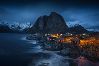 这张图片拍摄于挪威罗弗敦群岛 夜幕降临 幽蓝的天空下,巍峨的山峰矗立在远方,部分山峰覆盖着皑皑白雪,显得冷峻而壮观。 近处的海岸边,错落分布着几座红色的小木屋,屋内透出温暖的灯光,与冰冷的自然环境形成鲜明对比。海浪拍打着岸边的礁石,泛起层层白色浪花,整个场景静谧而美丽,充满了北欧风情,展现出人与自然和谐共处的意境。