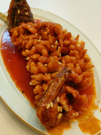 松鼠鱼是一道源自中国江苏省的传统名菜,以其独特的造型、酸甜适口的味道和外酥里嫩的口感而闻名。松鼠鱼的造型栩栩如生,鱼身被切成松鼠尾巴般的花刀,炸制后金黄酥脆,浇上酸甜汁后色泽鲜艳。外皮酥脆,内里鱼肉鲜嫩多汁,入口即化。酸甜适中,糖醋汁浓郁,与炸鱼的酥香完美融合。