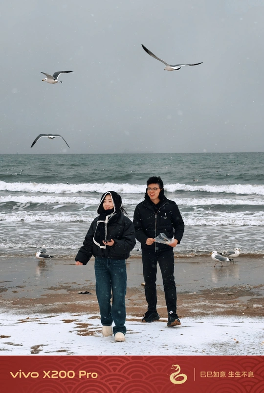 在这片宁静的海滩上,雪花轻轻飘落,海鸥自由翱翔。两人并肩而行,笑意挂在脸上。生活就像这片大海,有时风平浪静,有时波涛汹涌。但只要心中有爱,有梦想,就能像海鸥一样,勇敢地飞翔在广阔的天空中。无论前方有多少未知和挑战,只要两人携手同行,就能找到属于自己的那片温暖的港湾。
