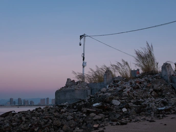 一个小渔村,电线、砖瓦组成的残垣断壁的场面,这个渔村不再有曾经的辉煌,这静谧的时刻,让失落的心得到一丝慰籍