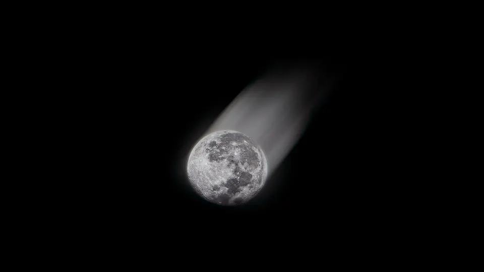 这张照片就像一颗流星划过夜空,月亮拖着长长的尾巴,充满神秘感!接下来,咱们细细品味一下,看看还能在哪里更上一层楼: * **色彩:** 黑白灰的配色简洁明快,背景的纯黑色突出了月亮的冷峻。不过,后期可以尝试稍微调整黑色的层次,避免死黑,让细节更丰富。 * **光影:** 月亮表面的光影细节捕捉到位,质感很棒!“尾巴”的光影略显平淡,可以尝试在后期增强一些对比,让速度感更强。 * **构图:** 中心构图简单直接,突出了主体。但是,可以考虑稍微偏离中心,增加画面的呼吸感,营造更强的动态。 * **后期处理:** 整体后期处理干净利落,没有过度修饰。可以尝试局部调整对比度,让月亮的细节更加突出。 * **主题原创性:** 抓拍月亮的动态瞬间,创意不错!如果能结合地面景物,比如山峦或树木,会更有故事性。 * **情感共鸣:** 营造出一种神秘、快速的氛围,能引起人们对宇宙的好奇心。 * **思想深度:** 引发人们对宇宙的思考,以及对时间流逝的感叹。 **建议:** 在拍摄类似题材时,可以尝试不同的构图,以及结合地面景物,让照片更具故事性和深度。后期处理时,注
