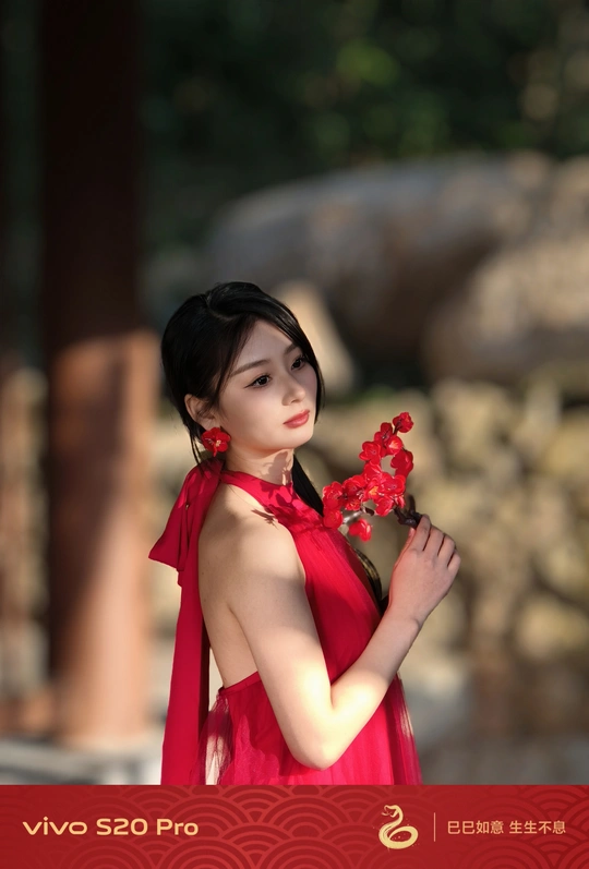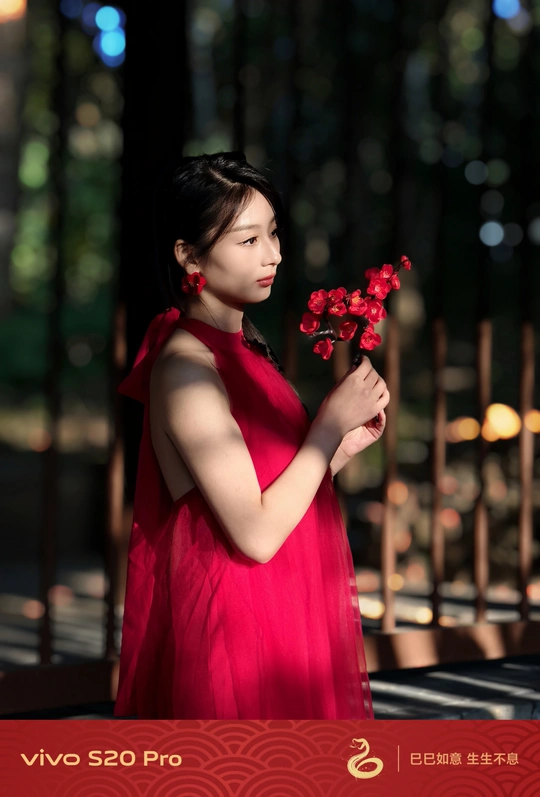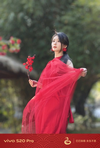 红裙翻卷二月风,手执朱梅胜霞浓。 俯首嗅得春信至,眼底星火映颊红。
