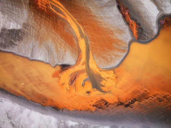 神奇的大自然,掺杂着矿物的河水呈现橙黄色,好像秋天的银杏叶落在地上。