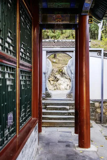《苏幕遮·游古园》 赤廊幽,朱柱立。窗牖雕花,曲径通幽僻。阶上苔痕添古意。石径蜿蜒,秋树含霜色。 步轻移,心自适。翠影摇风,隐隐闻啼唧。遥看洞门如画卷。岁月悠悠,沉醉园林里。