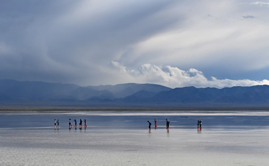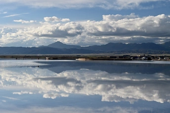 茶卡盐湖四周雪山环绕,平静的湖面像镜子一样,反射着美丽的令人陶醉的天空景色,被誉为“中国的天空之镜”,置身于盐的世界,漫步湖面如行走云端之上,水映天,天接地,人在湖间走,宛如画中游。