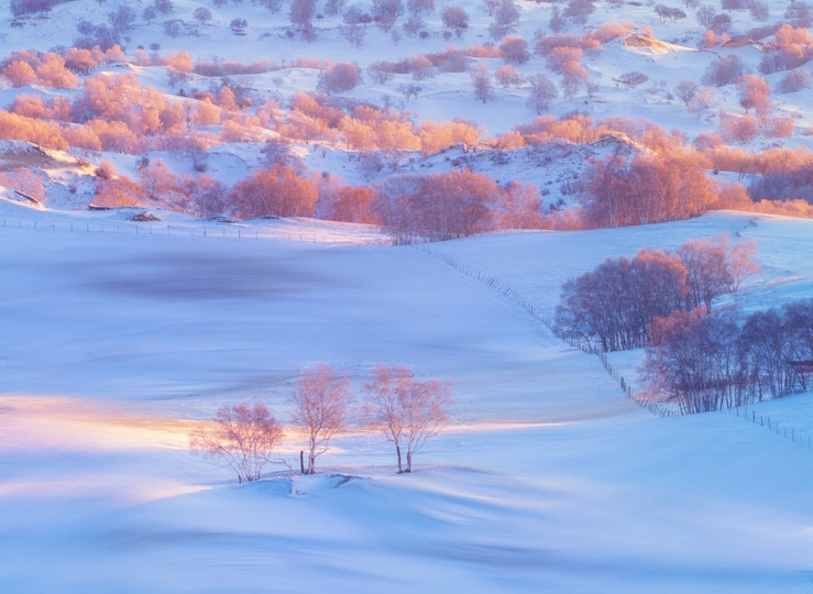 旭日东升,霞光晕染,雪原上一排排小树,呈现出迷人的色彩。