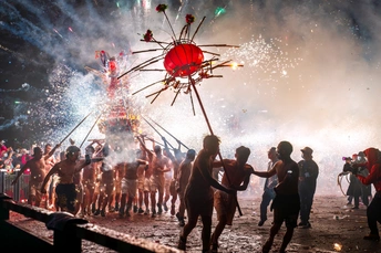 梅州埔寨烧火龙活动,在龙珠前迎下,巨龙咆哮出场。