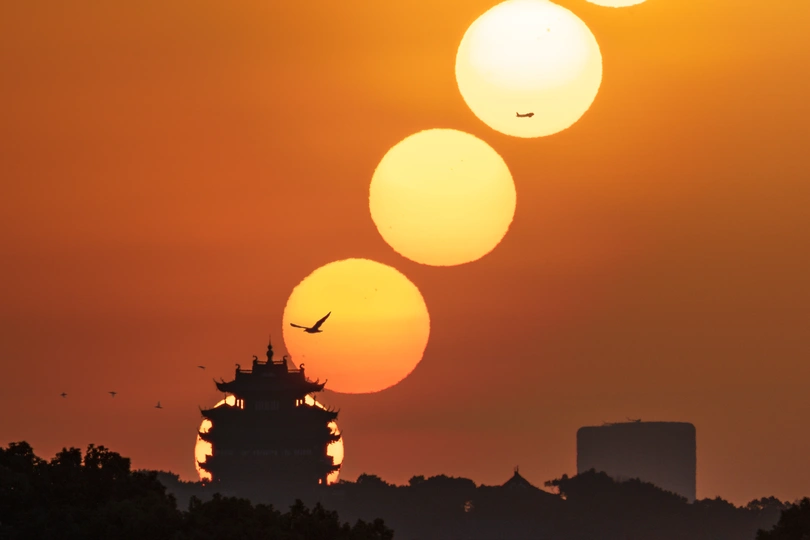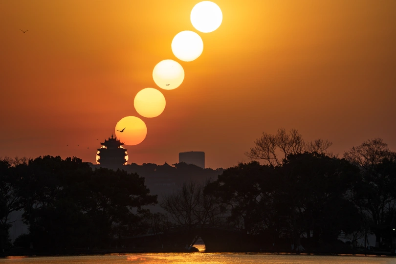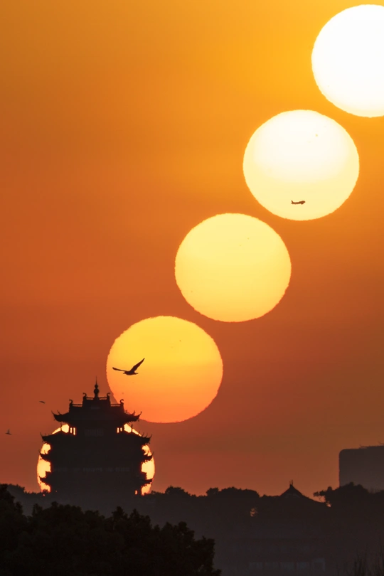两天杭州之行的第二悬,选择了西湖边上的城隍阁。这应该是杭州最简单的悬日目标了,杨公堤和苏堤都能提供很长一段时间的机位。 无惊无险,我顺利打卡了城隍阁的悬日日出。只是,构图有所欠缺,本想带点背景,放点焦段,带上苏提的压堤桥。但后期处理后,感觉不好看,还是直接裁剪了,只保留城隍阁吧。 另外,画面里不时有飞机飞过,正好出现在太阳升起的方向,只可惜离得太远,飞机显得太小了。倒是西湖边上的飞鸟离得近,显得很大。