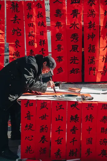 每年春节前,西安书院门会聚集很多书写并兜售对联人,有西安本地的知名书法家,也有民间的书法大师,他们边书写边兜售,使得书院门充满年味,也吸引大量的游客来这里游览,途中便是一位在自己摊位写春联的老人。