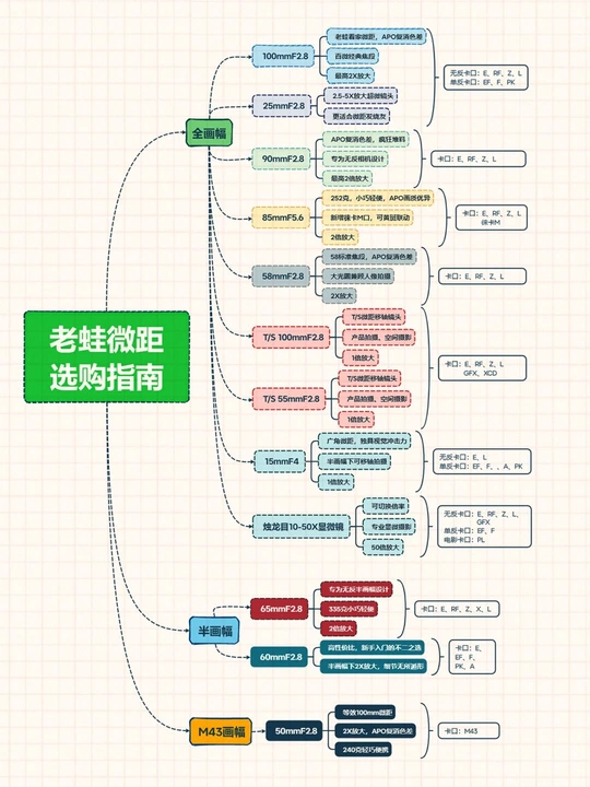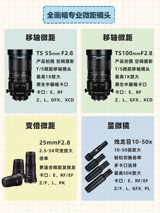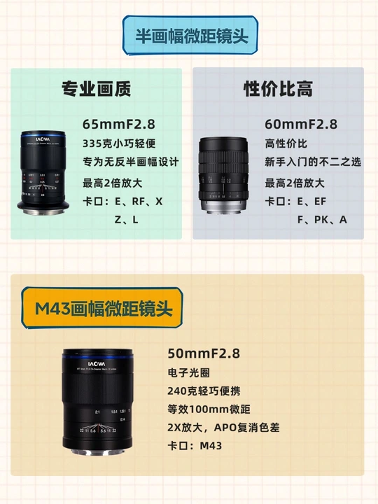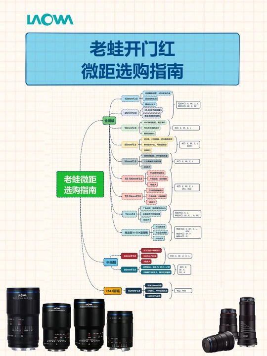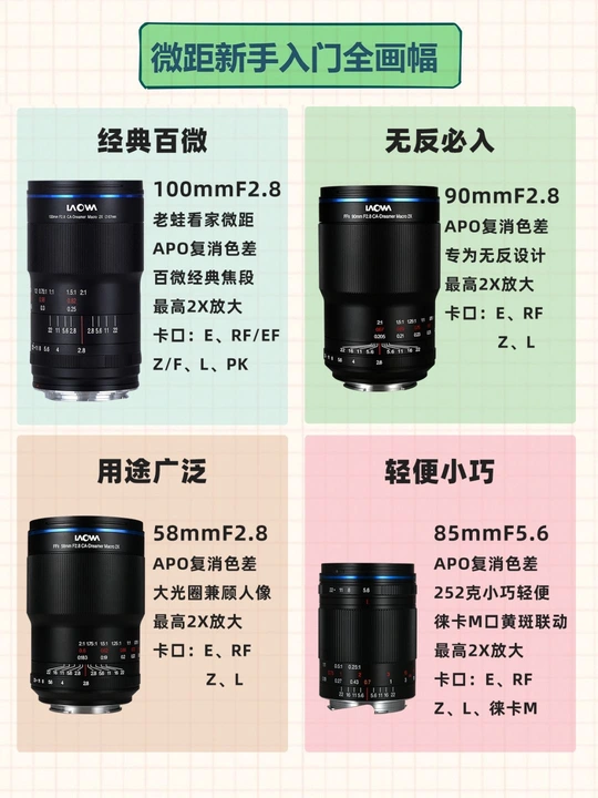 微距镜头因其独特的近摄能力和优秀的光学性能,能够捕捉到被摄物体的细微细节,展现出一个平时难以察觉的微观世界。 老蛙微距镜头更是普遍具有最高2倍放大倍率,下面就是老哇的几款微距镜头,总有一款适合你。 全画幅 100mmF2.8 90mmF2.8 85mmF2.8 58mmF2.8 25mmF2.8 15mmF4 T/S55mmF2.8 T/S100mmF2.8 烛龙目10-50X显微镜 半画幅 65mmF2.8 60mmF2.8 M43画幅 50mmF2.8
