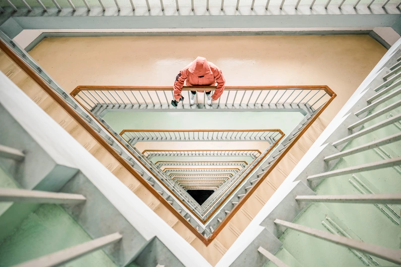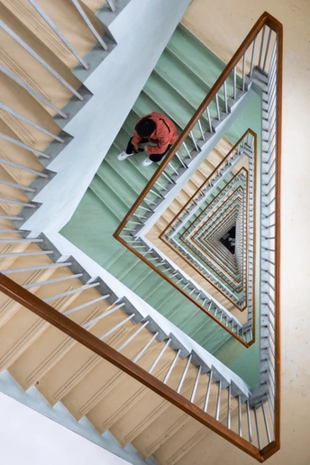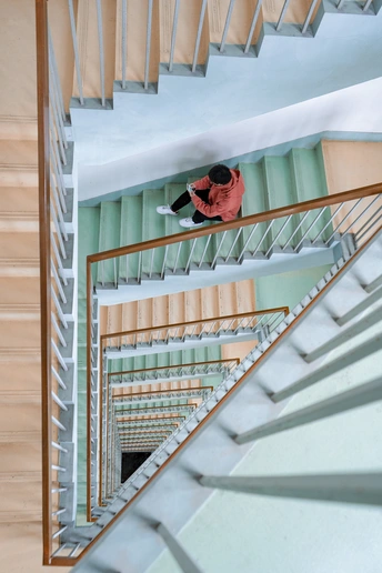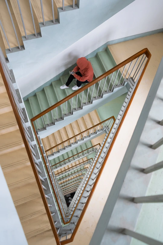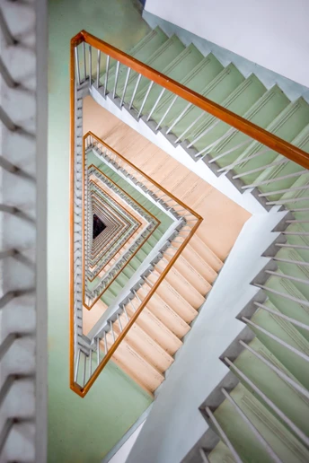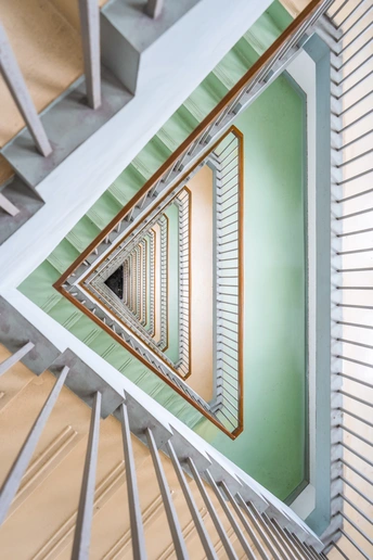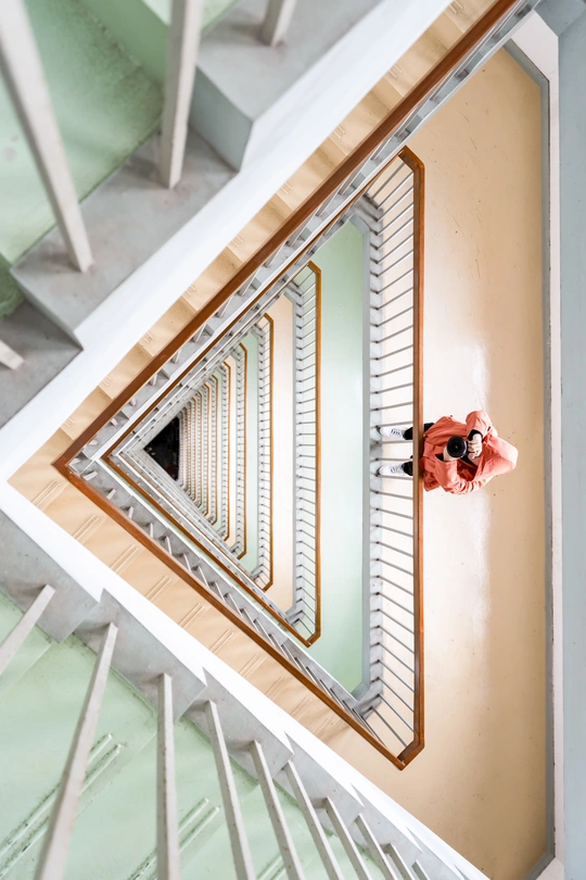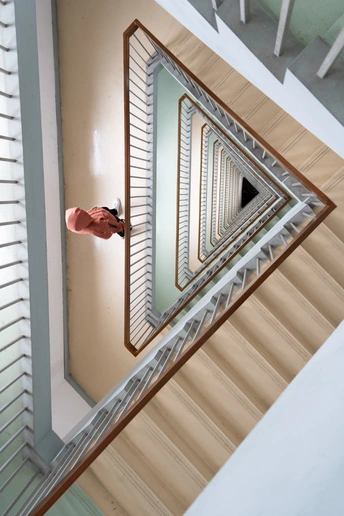 规整的三角形楼梯层层嵌套,由橙色和薄荷绿相间排列,仿佛马卡龙无尽的几何迷宫。