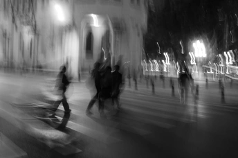 Alright, let's break down this intriguing black and white shot! Think of me as your friendly neighborhood photography guru, here to help you sharpen your skills. * **色彩:** 既然是黑白照片,色彩方面自然不用多说。但灰阶的处理至关重要。这里灰阶过渡还算自然,但部分区域对比度偏低,影响了视觉冲击力。 * **光影:** 光线质量是有的,城市夜景的光源提供了有趣的线条和动态。但曝光控制还有提升空间,部分高光溢出,细节丢失。试试包围曝光,或者后期调整高光和阴影。 * **构图:** 动态模糊的使用创造了独特的视觉效果,行人与背景建筑的结合也增加了画面层次。不过,构图略显随意,主体不够突出。可以尝试更明确的焦点或者更简洁的画面。 * **后期处理:** 黑白转换效果不错,但对比度还可以再加强一些,突出光影反差。注意避免过度锐化,以免产生噪点。 * **主题原创性:** 动态模糊的手法并不罕见,但用在