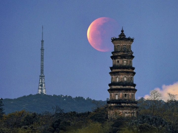 风景区,对面远处两座山上,两个跨古今的标志性建筑,在月亮的衬托下,让身在此景的我产生了幻觉,感觉在星际旅途中!