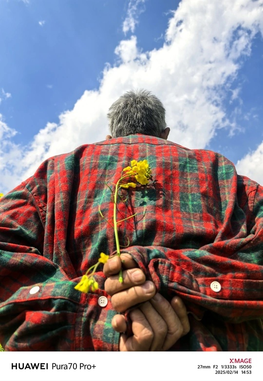 红格衬衫的褶皱里,藏着被农活磨糙的掌纹,却藏不住背后那枝明黄油菜花的倔强。爷爷的鬓角已杂着银霜﹣﹣我突然惊觉,记忆里那个扛着锄头的黑发身影,竟渐渐模糊成旧胶片的底色。他背手藏花的姿态,像极了年轻时偷摘野花给奶奶的模样。红与绿的格纹碰撞是生活的烟火,明黄花瓣刺破沉闷是未凉的浪漫,银白鬓发与湛蓝天空对峙,则是时间最锋利的注脚。XMAGE的色彩算法精准捕捉到这份冲突: 红格的饱和度里有岁月的厚重,油菜花的亮黄里藏着少年的莽撞,就连银发的灰度,都与蓝天的澄澈形成温柔的博弈。 这张照片里,"色彩"不再是单纯的视觉符号:红是操劳半生的热忱,黄是从未褪色的浪漫,白是被时光催熟的温柔。当爷爷把花藏在身后时,他藏起的何止是一枝春?那是被岁月磨平却未消失的心动,是黑发不再却依然鲜活的灵魂。让这些沉淀在生活褶皱里的色彩,告诉所有人: 岁月会染白头发,却染不淡藏在掌心的春天 。