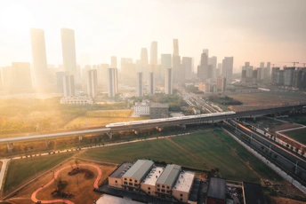 夕阳下,一列满载的高铁正飞驰而过城市钢铁森林,驶向远方。