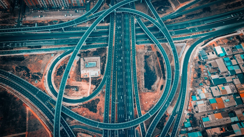 从高空俯瞰,城市立交桥如复杂精巧的迷宫,道路彼此缠绕交织,车辆穿梭其上,连接着城市的不同角落,展现现代交通的繁忙与有序。
