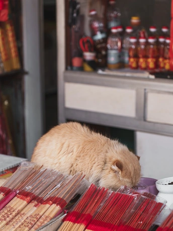 摄于潮州牌坊街附近,某个香纸铺前,店主的小猫正在埋头干饭